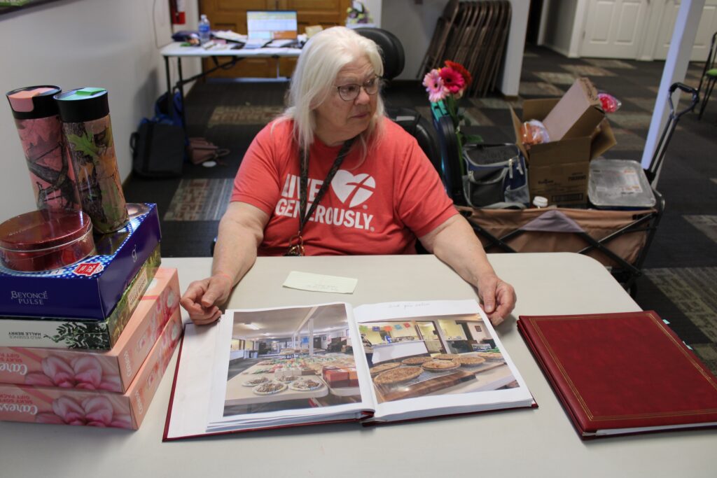 Founder Joanna Williams pages through a homemade scrapbook documenting previous meals served by Feed Medical Lake.
