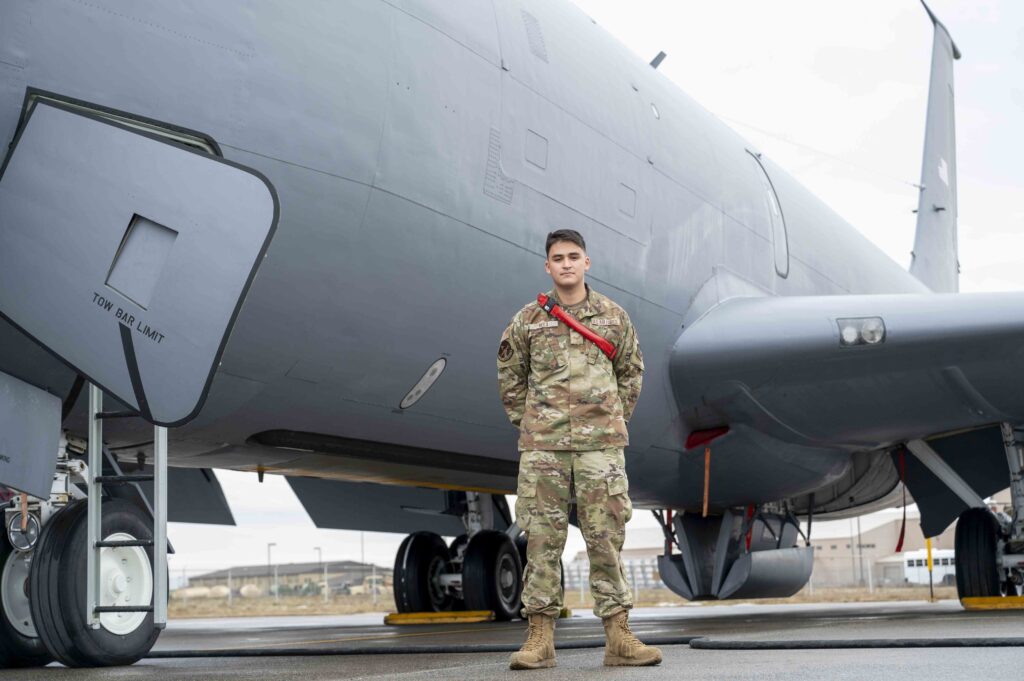 U.S. Air Force Senior Airman Caleb Vela, 92nd Aircraft Maintenance Squadron aerospace propulsion journeyman, poses in front a KC-135 Stratotanker at Fairchild Air Force Base, Washington, Jan. 23, 2026. Aerospace Propulsion specialists test, maintain and repair all parts of the engine, which plays a critical part in keeping aircraft and Airmen safe while executing the mission.